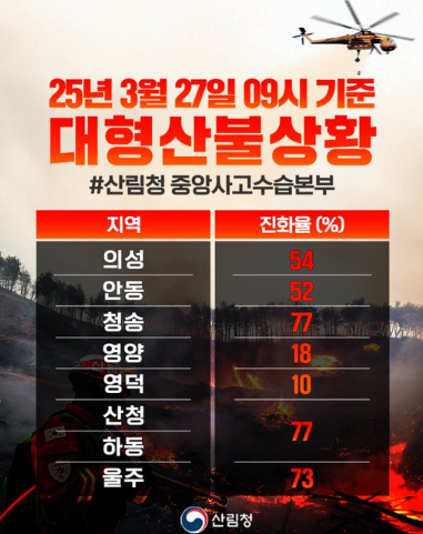 목 차산불 발생과 초기 대응산불 진화 작업대구 산불 피해산불 예방 안내 및 처벌 내용산불 발생과 초기 대응 지난 3월 26일 저녁 대구 달성군의 함박산에서 산불이 발생했습니다.정확히는 오후 7시 29분경 화원읍과 옥포읍 사이 해발 약 432m 함박산 정상 부근에서 발생했습니다. 불이 빠르게 번지면서 달성군에서는 8시 51분에 주민들과 등산객들에게 대피 문자를 보냈다고 합니다.산림당국은 발 빠르게 대응해서 산불 발생 1시간 만에 산불 대응 1단계를 발령했습니다. 밤새도록 산불 확산을 막기 위해 노력했습니다.산불 진화 작업 오늘(27일) 아침이에 본격적인 진화 작업이 시작됐습니다. 헬기 5대, 차량 53와 580명이 넘는 인력이 투입되었습니다. 그 결과 오전 6시에는 진화율 90%를 달성했고 8시경에는 주불..