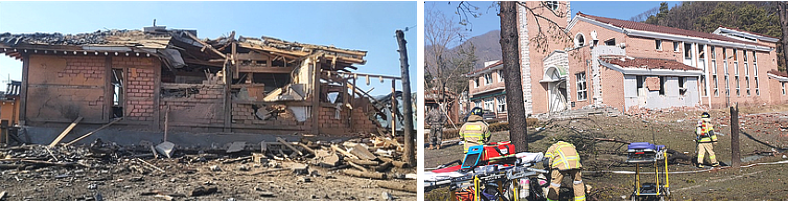 | 건물 피해 | 주택5채, 성당1채, 비닐하우스 여러동, 기타 건물 8동이 피해를 입은 것으로 확인되었습니다. |