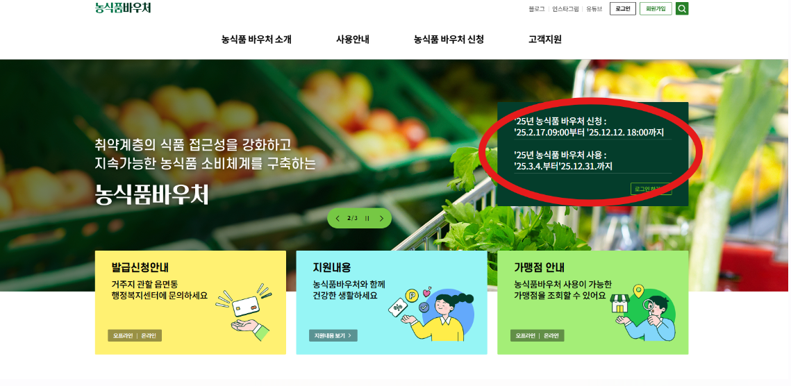 - 신청 접수: 주민센터 또는 온라인 신청 가능 (농식품바우처홈페이지 https://www.foodvoucher.go.kr/view/fma/ordmain/main)