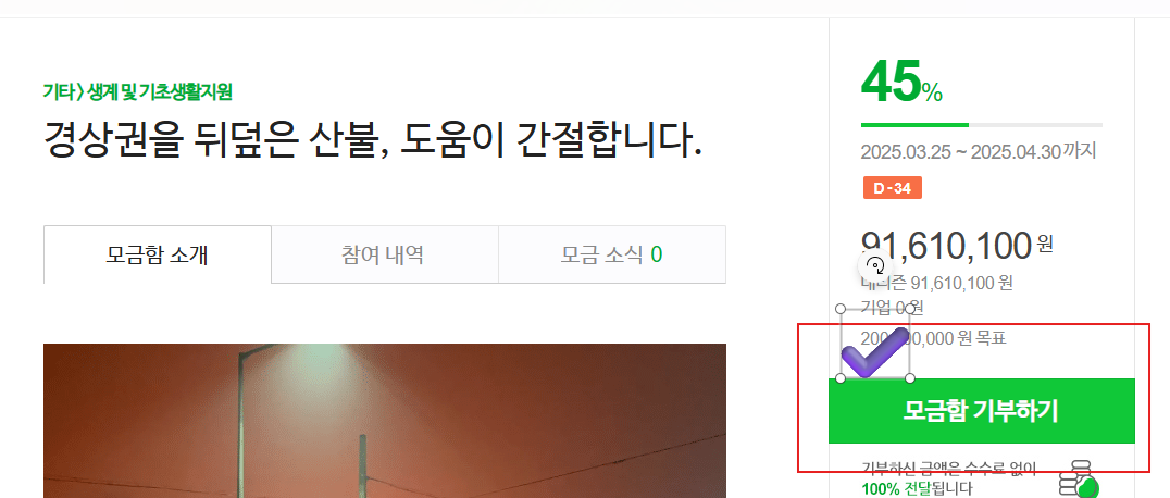 네이버 해피빈 기부 검색 또는 옆에 근처 긴급모금 클릭하시면 됩니다.
