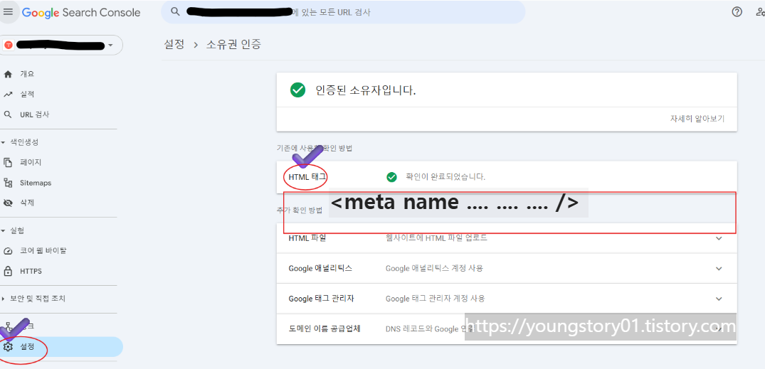 위 방법과 같이 구글 서치 콘솔 설정에 갔는데 기존에 사용했던 html태그가 안보였습니다. 당황하지 마세요.(저는 당황했습니다.. :)