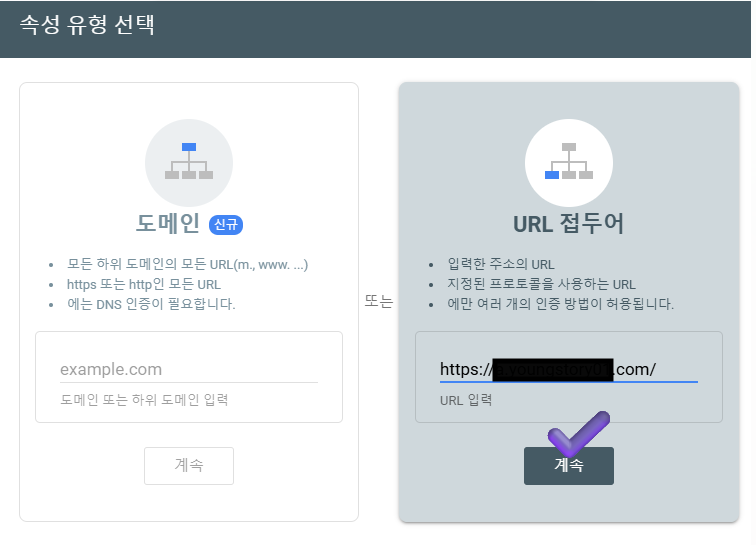 2. 속성 유형 선택 창이 뜹니다. URL 접두어에 하위도메인의 URL주소를 입력해 주세요. https로 시작되는 주소를 정확히 입력해주셔야 합니다. 입력 후 계속을 클릭합니다.